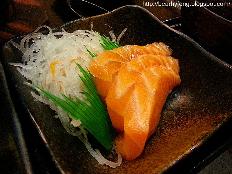 | 朋友还order了一盘新鲜的三文鱼让大家享用呢! 本来不吃生三文鱼的我,现在竟然吃了! 本人不大爱吃腥腥的食物,可是这里的三文鱼没有腥味,而且咬下口很爽口的感觉! 肉质嫩嫩而且厚厚的呢! |