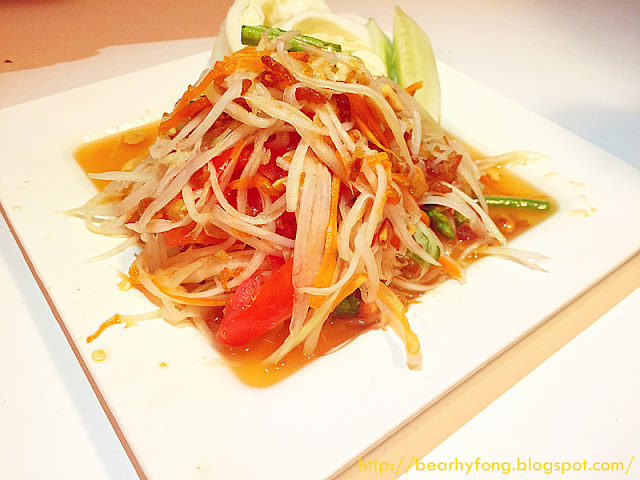 | Papaya Salad - RM 15.00 本小姐也想大家介绍泰国另一个前菜给大家呢!就是木瓜沙拉呢!里面都包括了木瓜,红萝卜,长豆,辣椒,花生,味道就有点酸酸辣辣的呢!吃了这道前菜后,真的让本小姐胃口大增呢! |